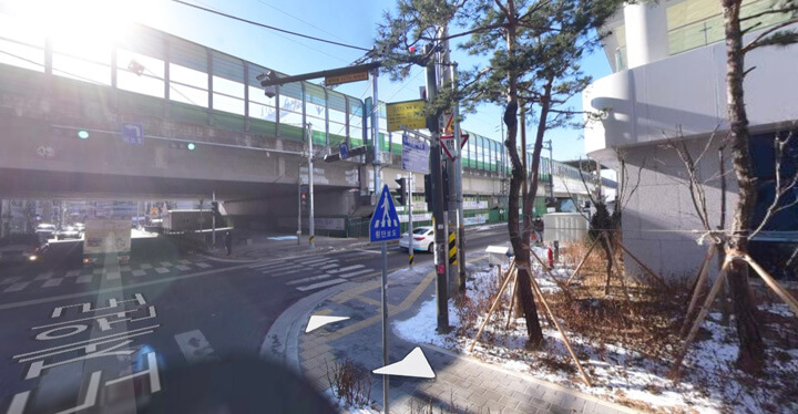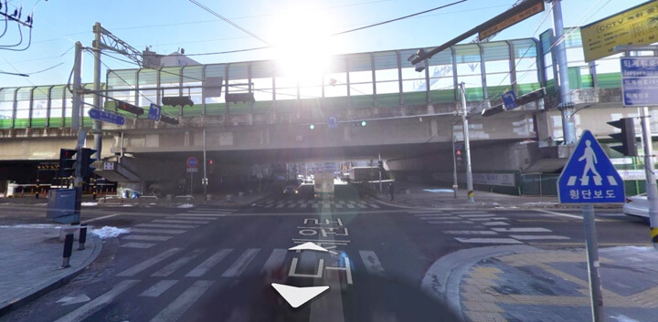 실제 장소에 와있는 것처럼 거리뷰가 크게 나타납니다. 하얀색 화살표를 클릭하여 앞으로 나아갈수도 있고 뒤로 돌아갈 수도 있습니다. 화면을 마우스로 클릭한채로 좌우로 움직이면 거리뷰 화면 회전이 가능합니다.
