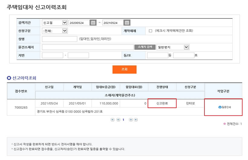 - 접수된 임대차 신고서를 공무원이 확인을 마치고 승인처리를 하게 되면 신고 완료를 확인할 수 있습니다. 작업 구분란에 '필증 인쇄'를 클릭하면 신고필증을 인쇄할 수 있습니다.
