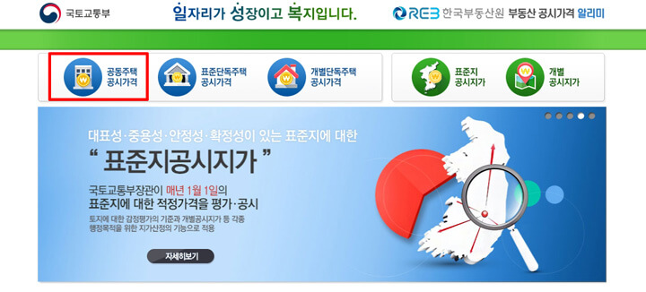 부동산공시가격알리미 웹사이트를 이용하시면 공동주택 공시가격 뿐만 아니라 표준단독주택, 개별단독주택, 표준지 공시지가, 개별 공시지가 등을 확인하실 수 있습니다.