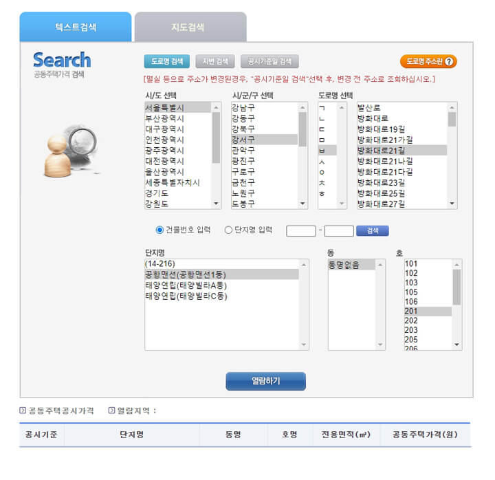 해당하는 공동주택의 공시지가를 바로 확인하실 수 있습니다.